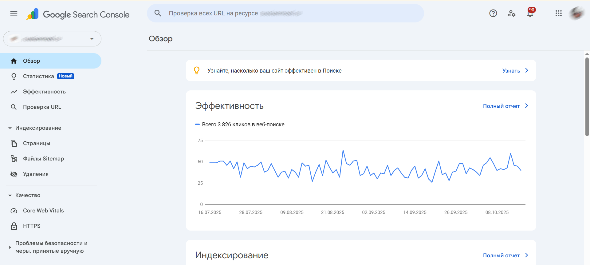 Пример дашборда новой версии Google Search Console — инструмент для анализа кликов, показов и позиций сайта в поиске Google