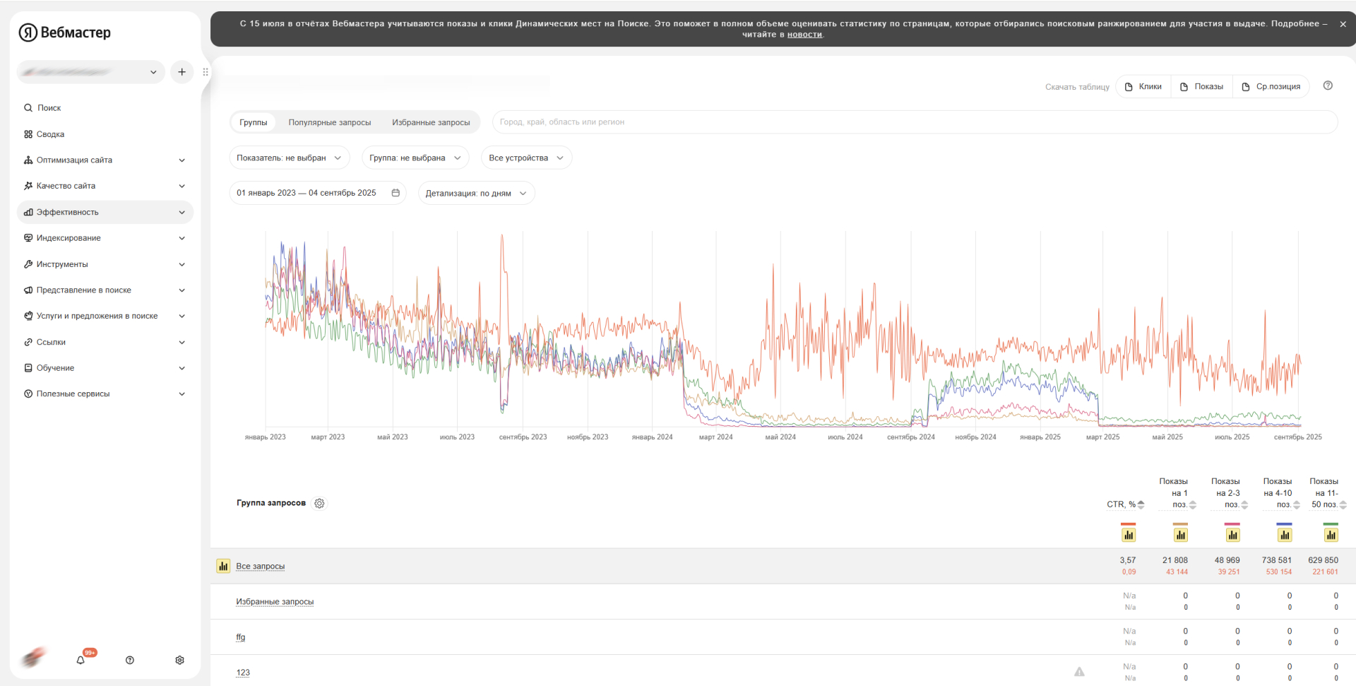 Пример отчета по статистике поисковых запросов в Яндекс Вебмастере. Здесь можно отследить динамику кликов, показов и CTR по отдельным группам запросов