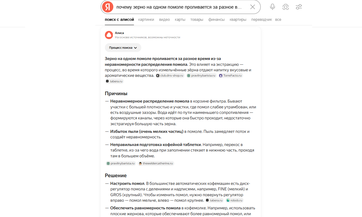 Пока технологии развиваются, поэтому в нейровыдаче попадаются ошибки. Например, по запросу «почему зерно на одном помоле проливается за разное время утром и вечером» Google выдал почти точный ответ, а Яндекс — совсем не по теме. Это показывает, что алгоритмы генерации еще далеки от идеала.