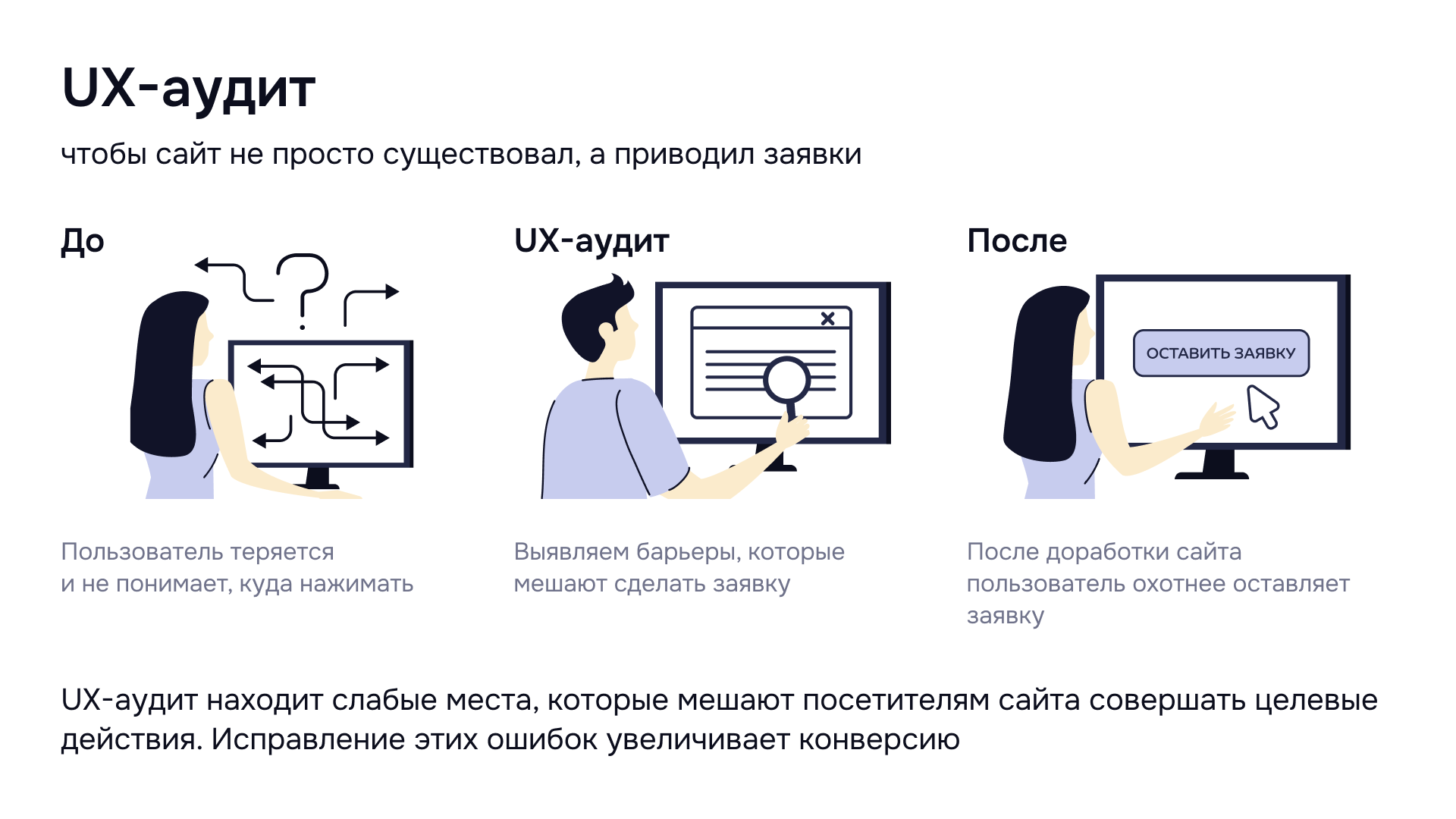 Если видим, что сайт неудобен для пользователя, например, у него сложная навигация или слабые формы захвата, подключаем UX-аудит. Почему это важно — показали ниже в карусели.
