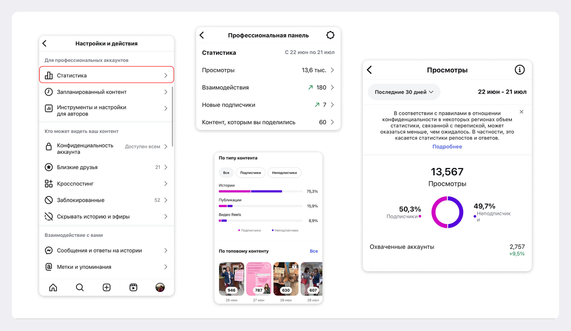 Пример статистики Instagram*: видно, какие форматы работают лучше, откуда приходят пользователи и сколько взаимодействий вызывают посты и сторис