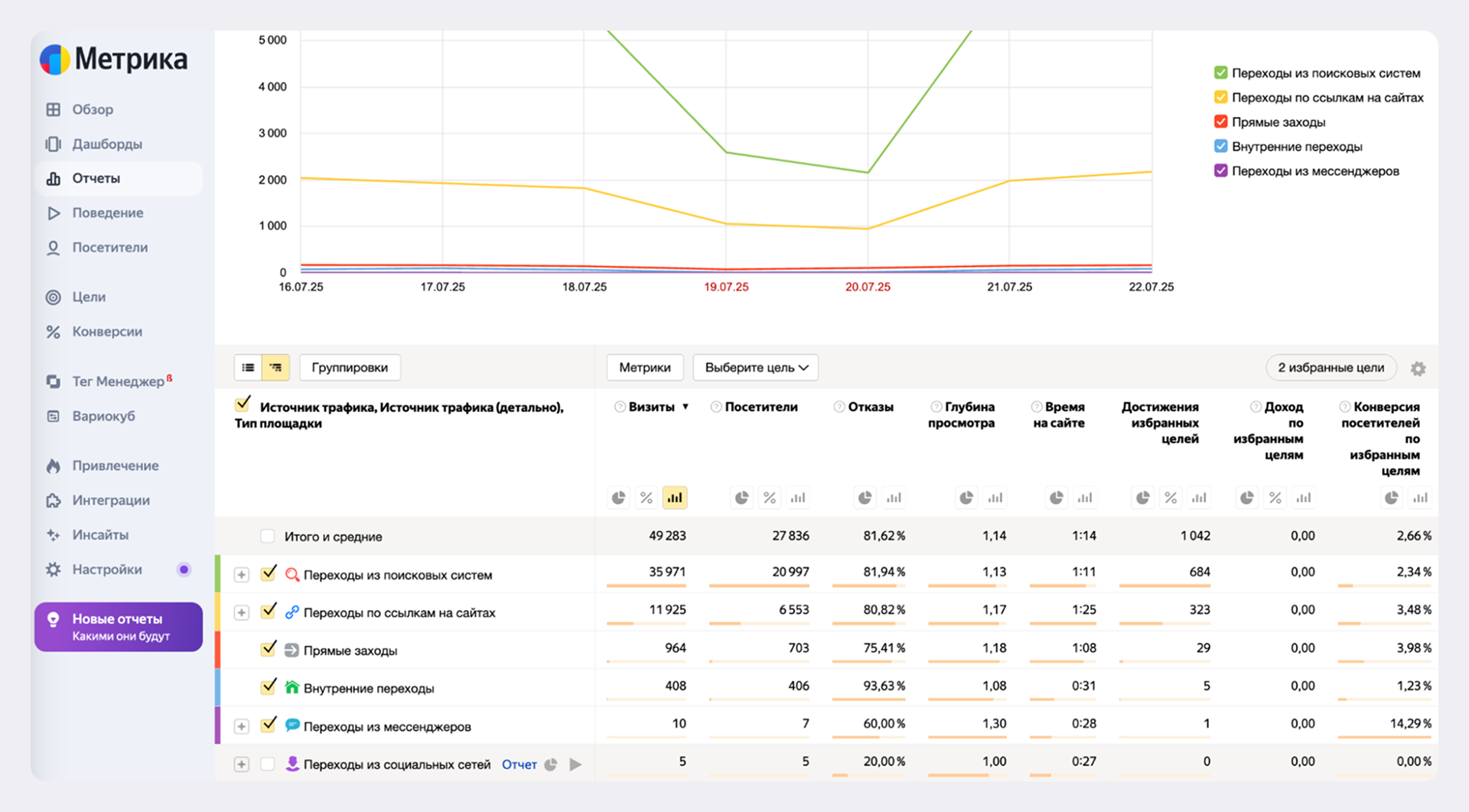 Пример SMM-отчета в Яндекс Метрике: видно, сколько трафика приходит из соцсетей, сколько пользователей выполняют целевые действия и как они ведут себя на сайте после перехода