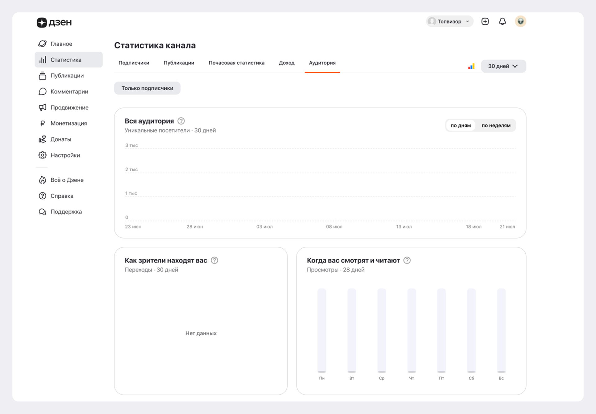 Метрики в Дзене показывают общую статистику: демографические показатели аудитории, динамику подписчиков, данные по доходам и информацию по каждой публикации — количество показов, дочитываний и среднее время чтения статьи. Смотреть все это нужно в Студии Дзена.