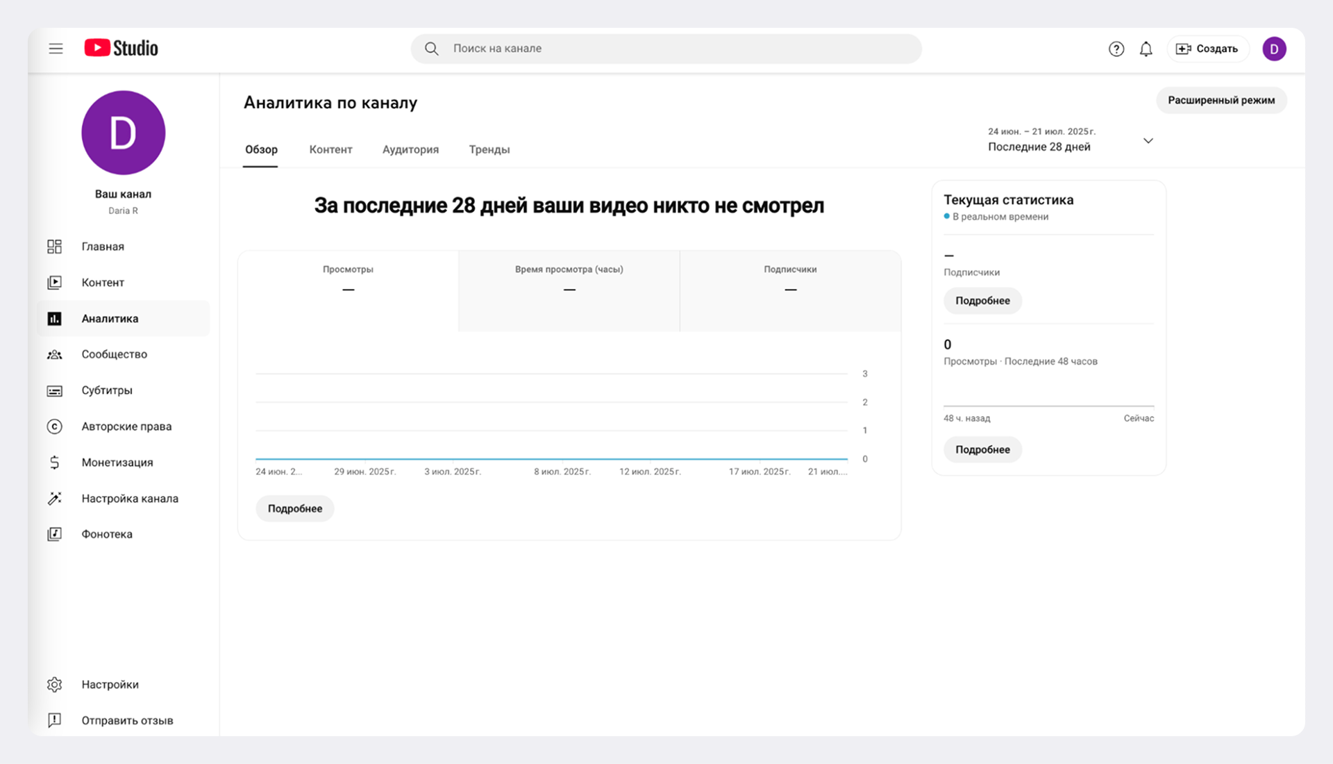 Аналитику видео на YouTube можно посмотреть в YouTube Studio. Здесь легко отследить важные для видеоконтента параметры: просмотры, время просмотров в часах, число постоянных и новых зрителей.