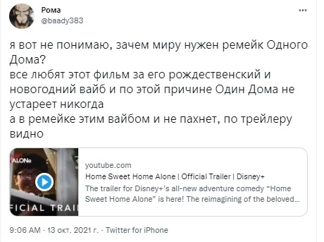 Ремейк появится на стриминговом сервисе Disney+ 12 ноября. Дата российского релиза пока не оглашена, но зрители уже не хотят его смотреть. Однако «Один дома 6» не первый и не последний перезапуск.