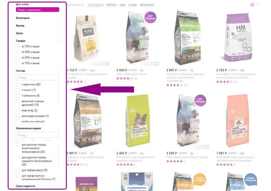 Маркетплейсы типа Wildberries никак не могут настроить для категории собачьих кормов фильтр по объему мешка, хотя это важный параметр. «Озон» вот сделал, и теперь у них как минимум один клиент покупает чаще.
