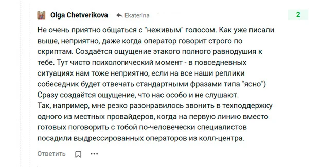 В крупных компаниях дорогостоящие боты умеют вести диалог практически неотличимо от реальных консультантов. Скрипты для них включают десятки вариантов возможных вопросов и ответов в сотнях комбинаций.