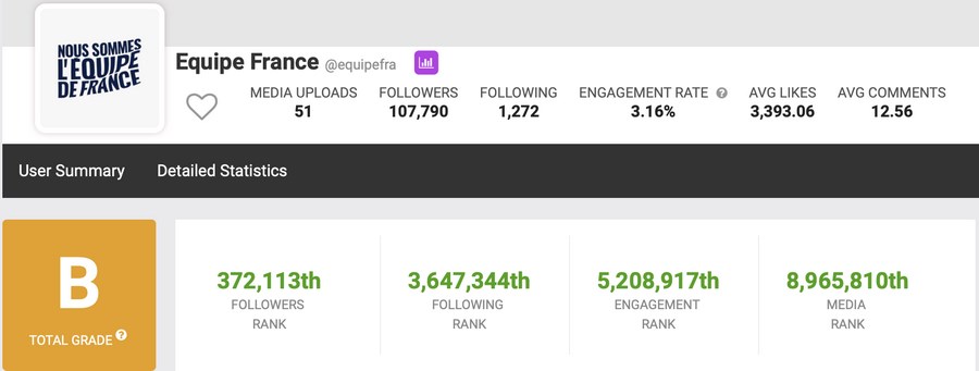 Instagram* Франции. В цветах национального флага, фото – в основном спортсмены с национальным флагом. Высокий ER, посты активно лайкают: 2-6 тыс лайков на пост. Самый популярный пост с трогательным фото знаменосцев сборной, 8,2 тыс. лайков.