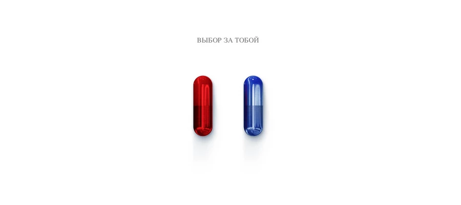 Главная страница сайта минималистична: на ней изображены две кликабельные таблетки, красная и синяя.