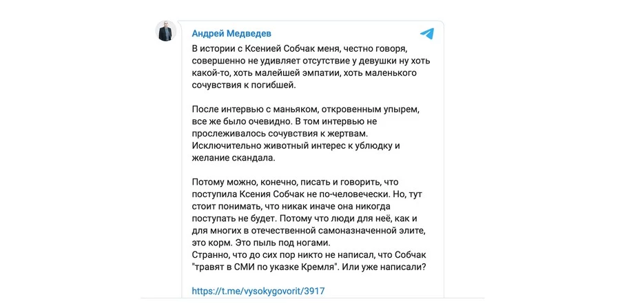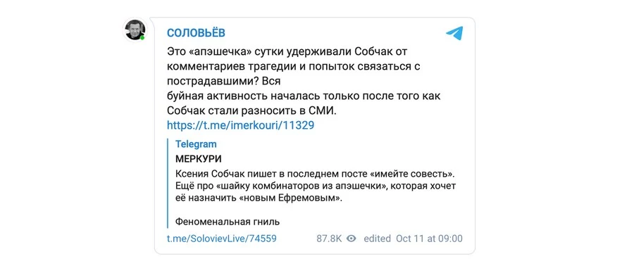 Кстати, пост команда Собчак удалить забыла, но зато остановила работу над проектами: по понедельникам на канале «Осторожно: Собчак!» публиковались видео, но 11 октября новый ролик не вышел. Может быть, так Собчак выражает свои соболезнования. А может, рекламодатели отказались платить за размещение.