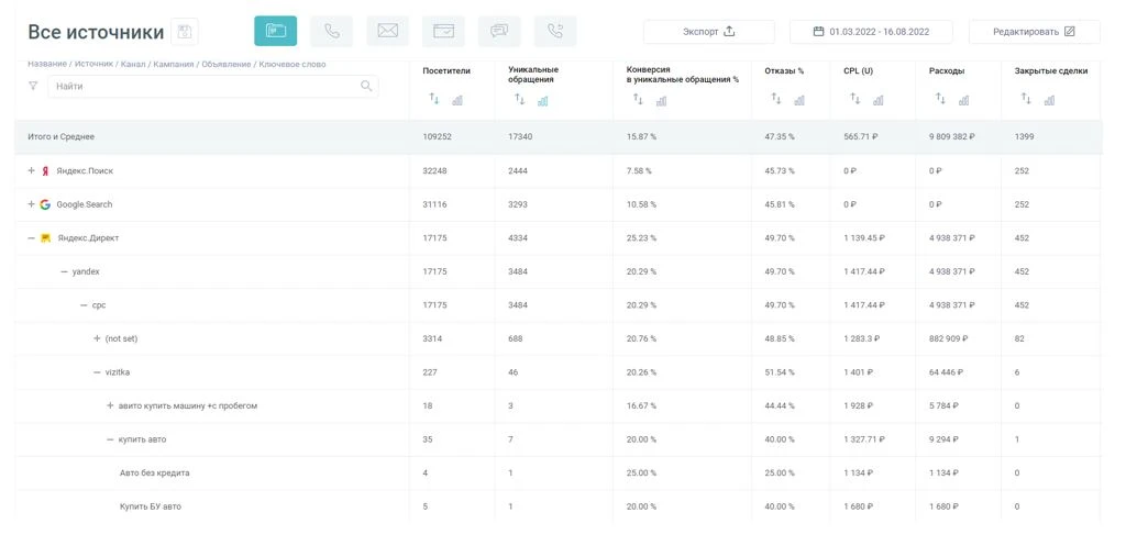 - рейтинг рекламных источников, поможет сравнить работу площадок и понять источник потока клиентов;