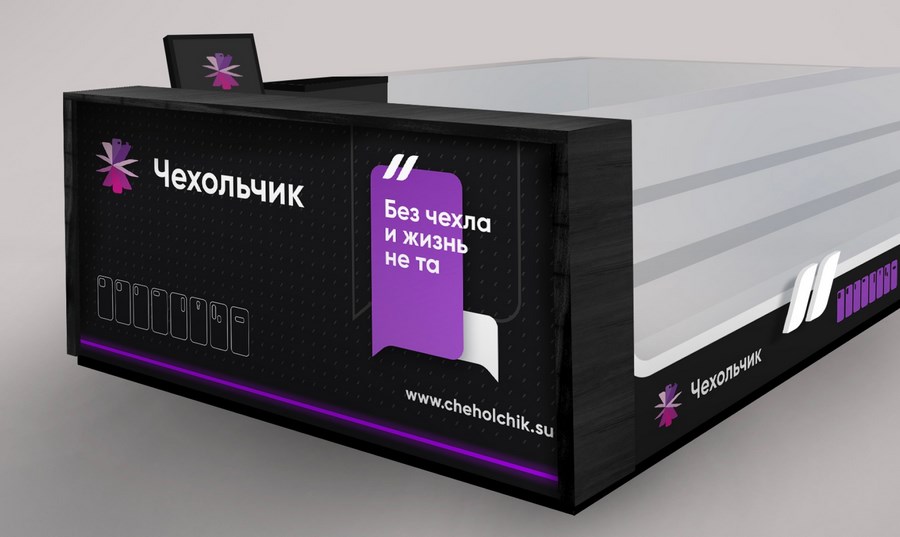 Стиль был разработан в двух цветовых решениях – бело-фиолетовом и черно-фиолетовом. В процессе работы мы узнали, что при оформлении торговых точек очень сложно найти облицовку стоек и поверхностей в фиолетовом цвете, поэтому мы использовали в качестве основы белый и черный цвета, а фиолетовые вставки реализовали точечно, что позволило сделать хорошие акценты.